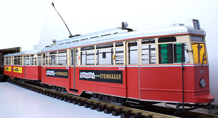 Wir haben an diesem Abend drei Straßenbahn-Modelle im Maßstab 1:22,5 im Saal und in unserer Ausstellungsvitrine weitere Straßenbahnmodelle im Maßstab 1:87!